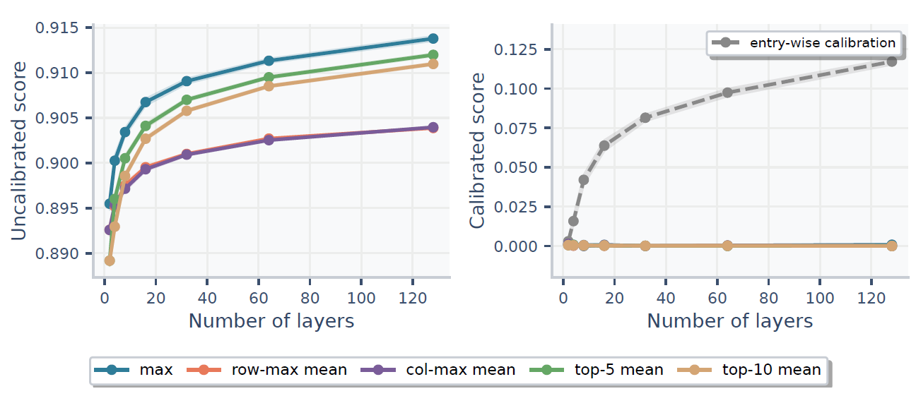 If you summarize similarity by searching over many layer pairs (e.g., taking the maximum), uncalibrated summaries inflate with depth. Aggregation-aware calibration fixes this by calibrating the final statistic you report.