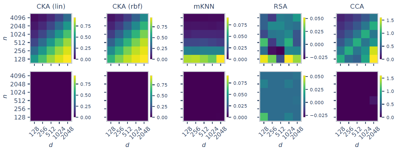 - Width confounder: increasing embedding dimensionality (relative to sample size) can inflate similarity scores, creating non-trivial “chance similarity”.