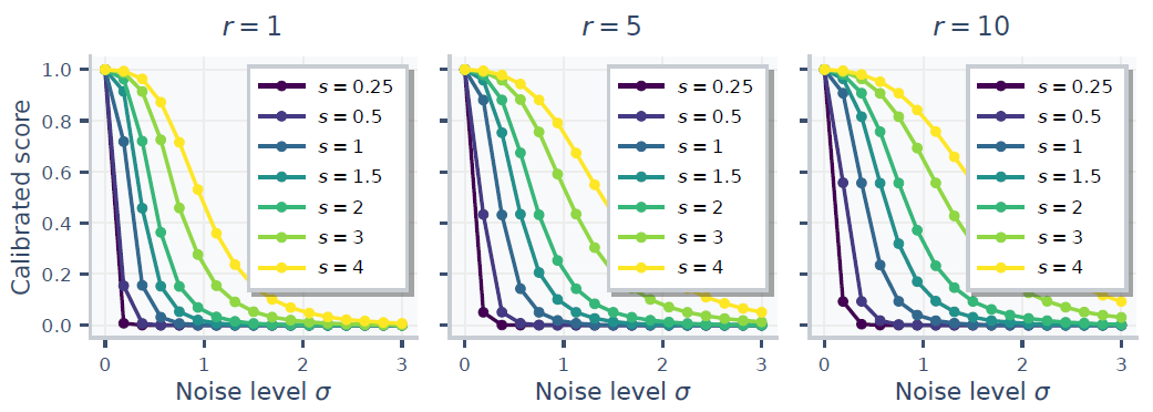 When we inject genuine shared structure, calibrated scores remain high when the signal is strong and degrade smoothly as noise increases, i.e., we remove confounds without washing out meaningful alignment.