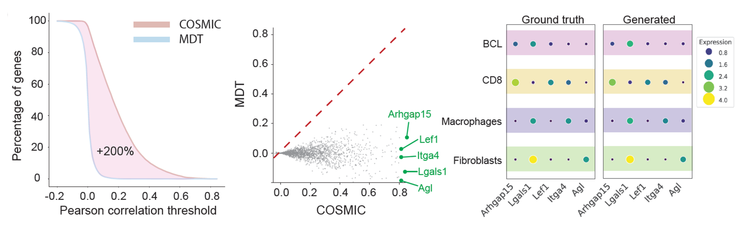 At the gene level, COSMIC identifies a subset of genes whose expression can be robustly predicted from morphology, including cell-type marker genes with high correlation to ground truth. These results demonstrate that nuclear morphology encodes precise information about specific transcriptional programs.