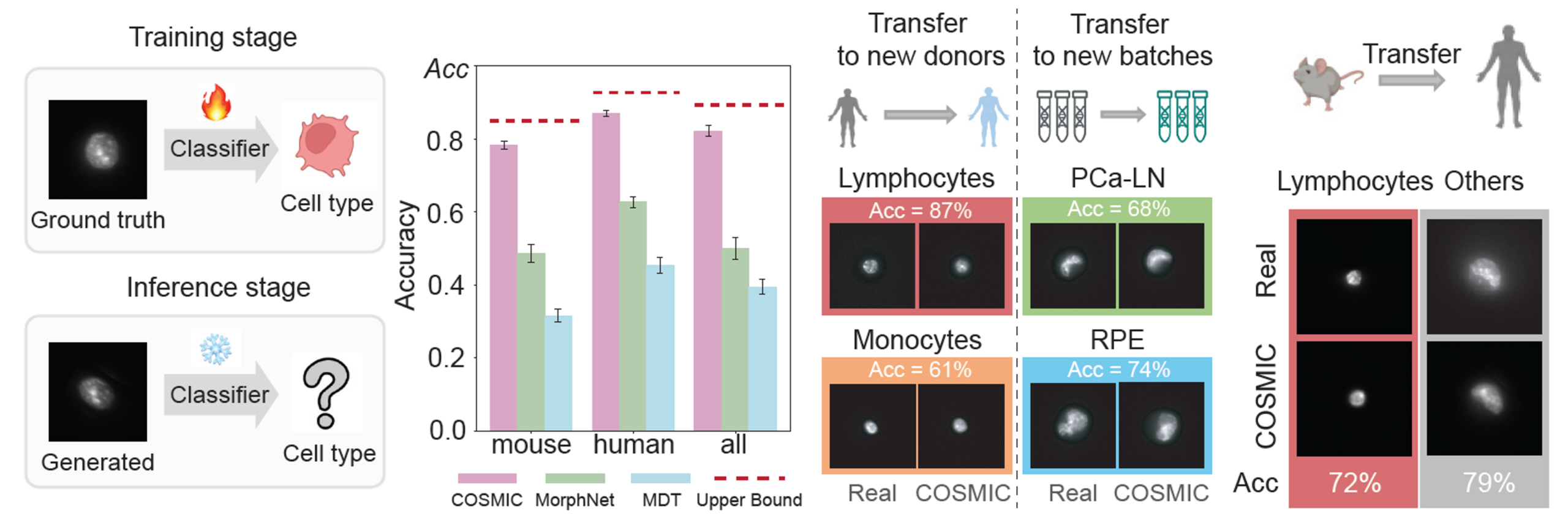Generated images retain sufficient biological signal to support accurate cell type classification, approaching the performance achieved on real microscopy images. COSMIC generalizes to unseen batches, new donors, and even across species.